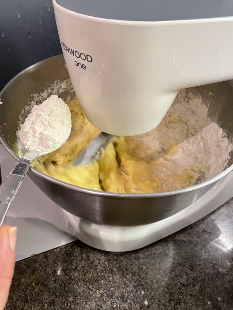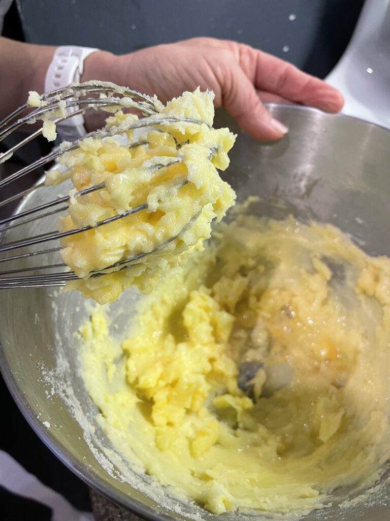 - Add in the eggs one by one to the mixture